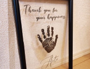 お子様の手形を思い出に!透明フィルムに加工を行い額縁に入れてプレゼントします♪